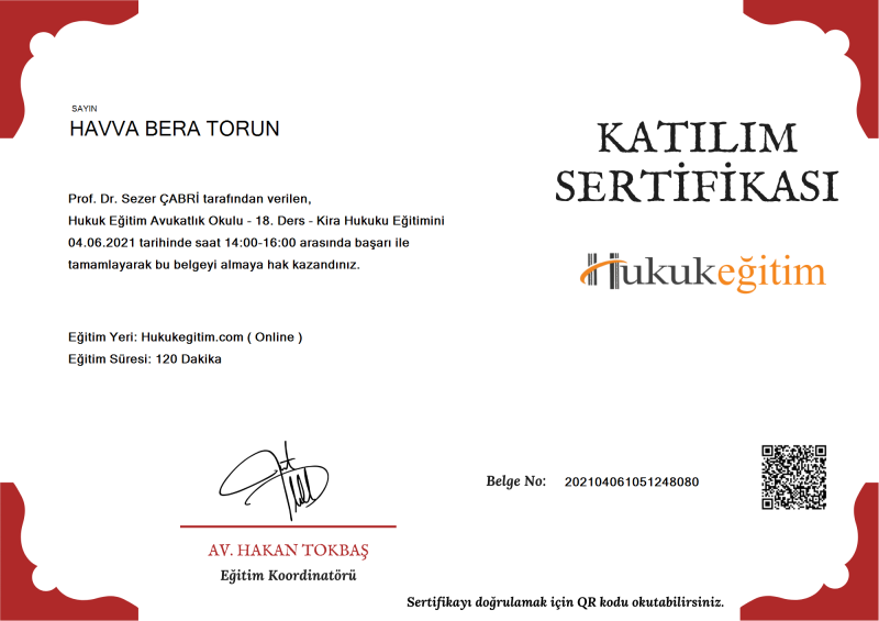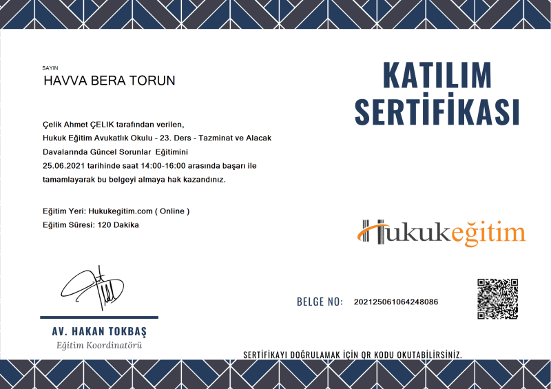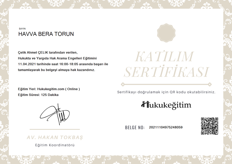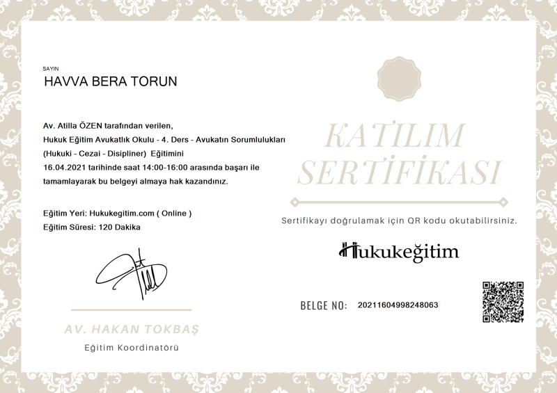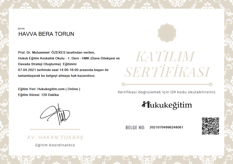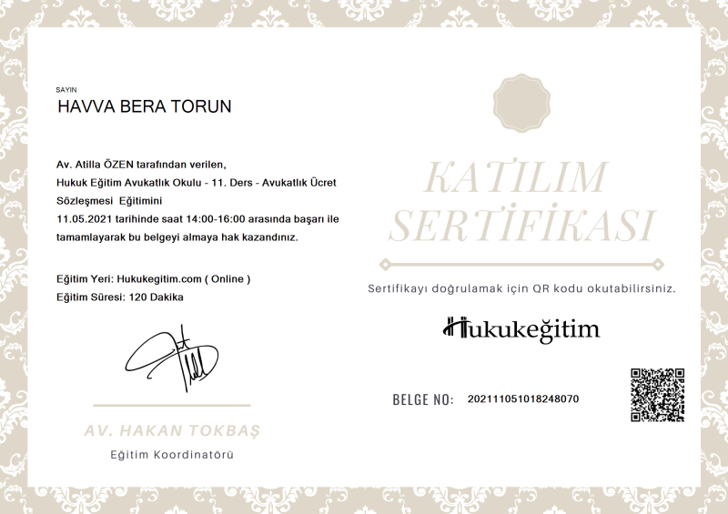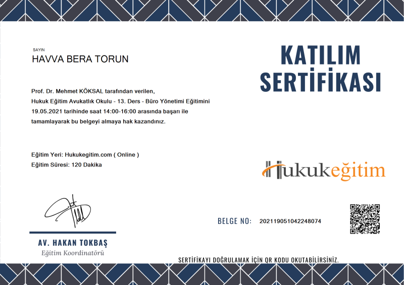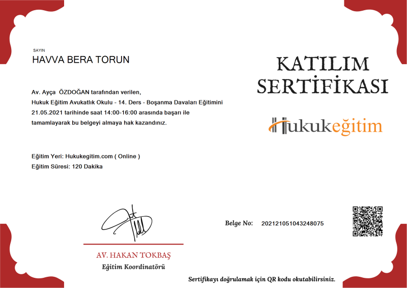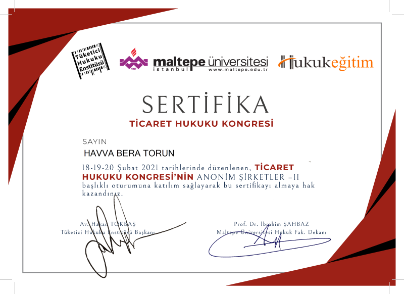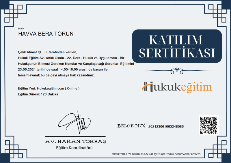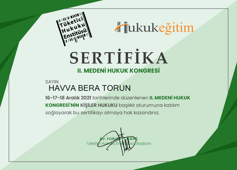 Havva Bera Torun, İstanbul Özyeğin Üniversitesi Hukuk Fakültesi’nden 2020 yılında mezun olmuştur. Hukuk alanındaki bilgi ve deneyimini profesyonel avukatlık kariyerine taşıyarak, 5 yıldır aktif olarak avukatlık yapmaktadır.